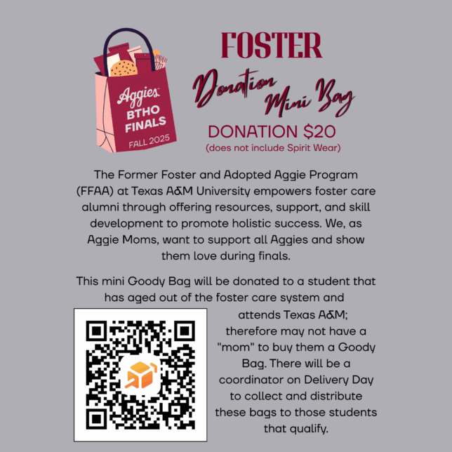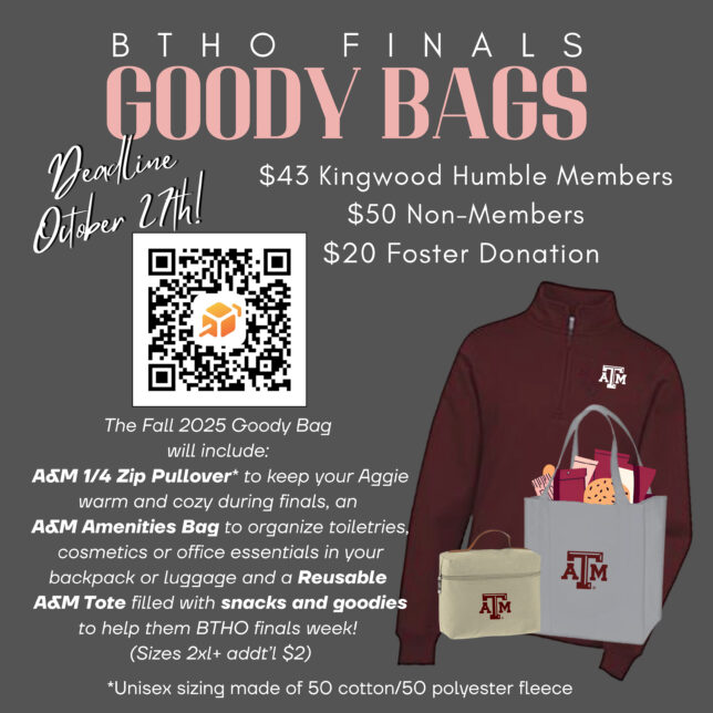 Goody Bags are a much-anticipated part of “finals season” in Aggieland! You order and they are picked up on campus by your Aggie.
