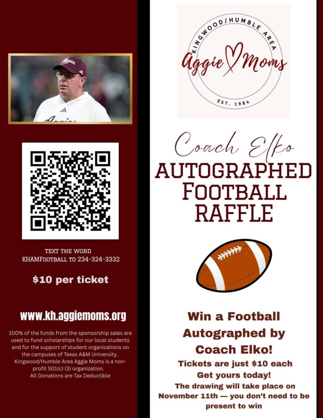 Don’t miss your chance to own a Coach Elko signed football—get your raffle tickets today! Your participation will help us raise funds for incoming Aggies! Deadline to purchase is November 11th!